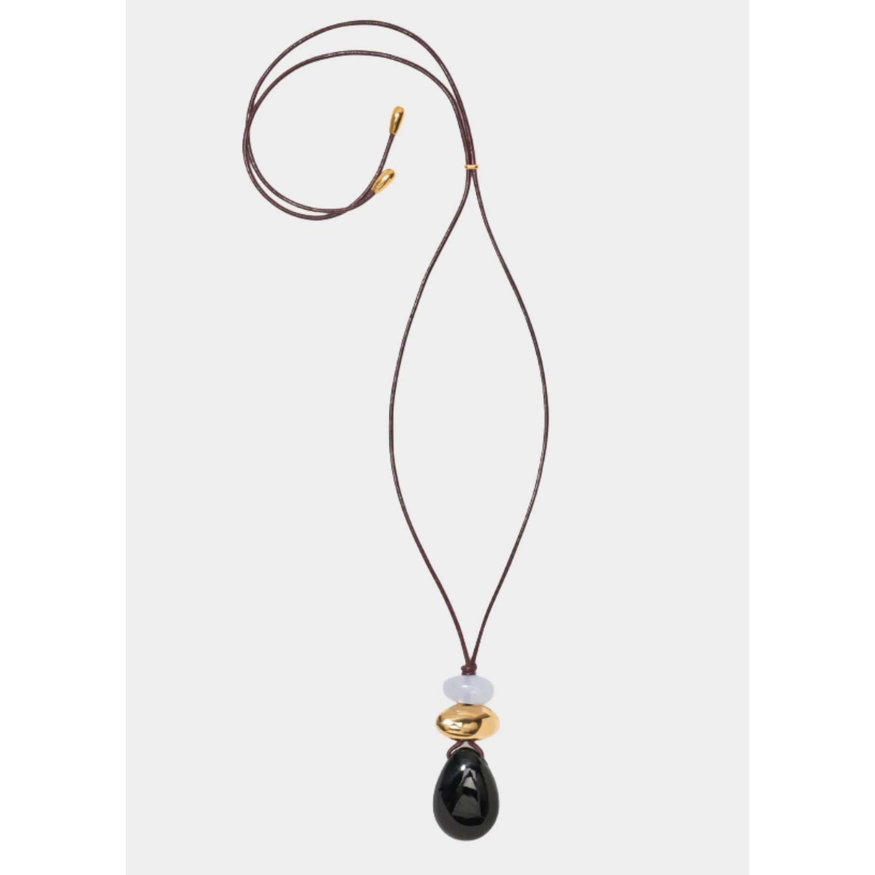 The Museo Cord Necklace by Lizzie Fortunado blends a dark brown leather cord with chalcedony and gold-plated brass beads, crowned by a black onyx teardrop pendant for a refined, elegant touch.
