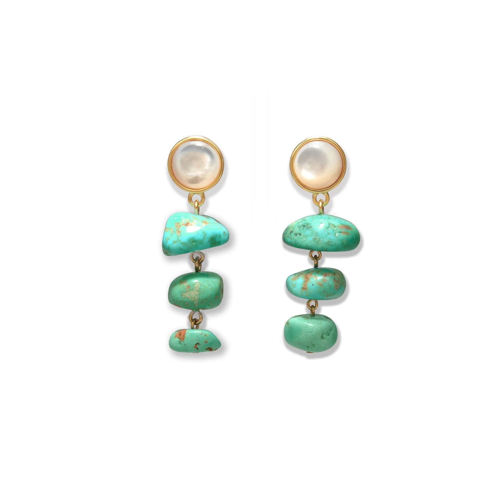- Gold-plated brass, mother-of-pearl tops, turquoise