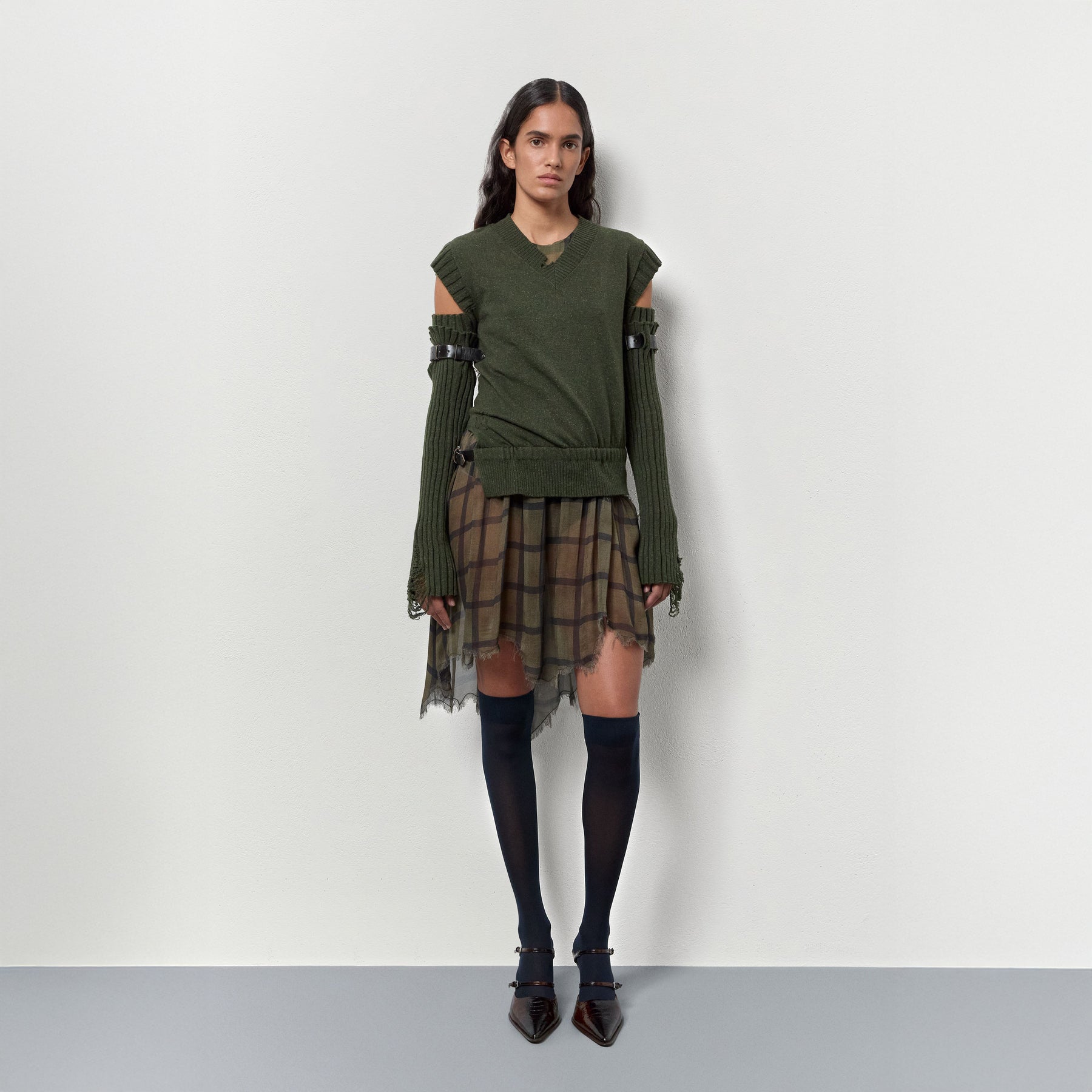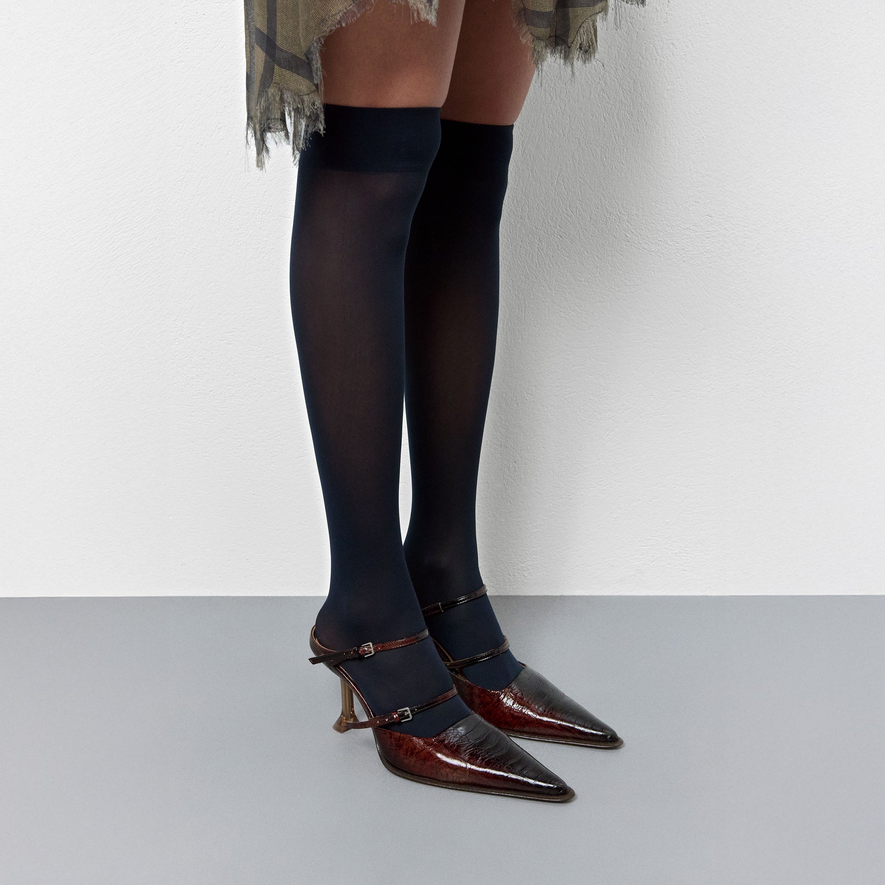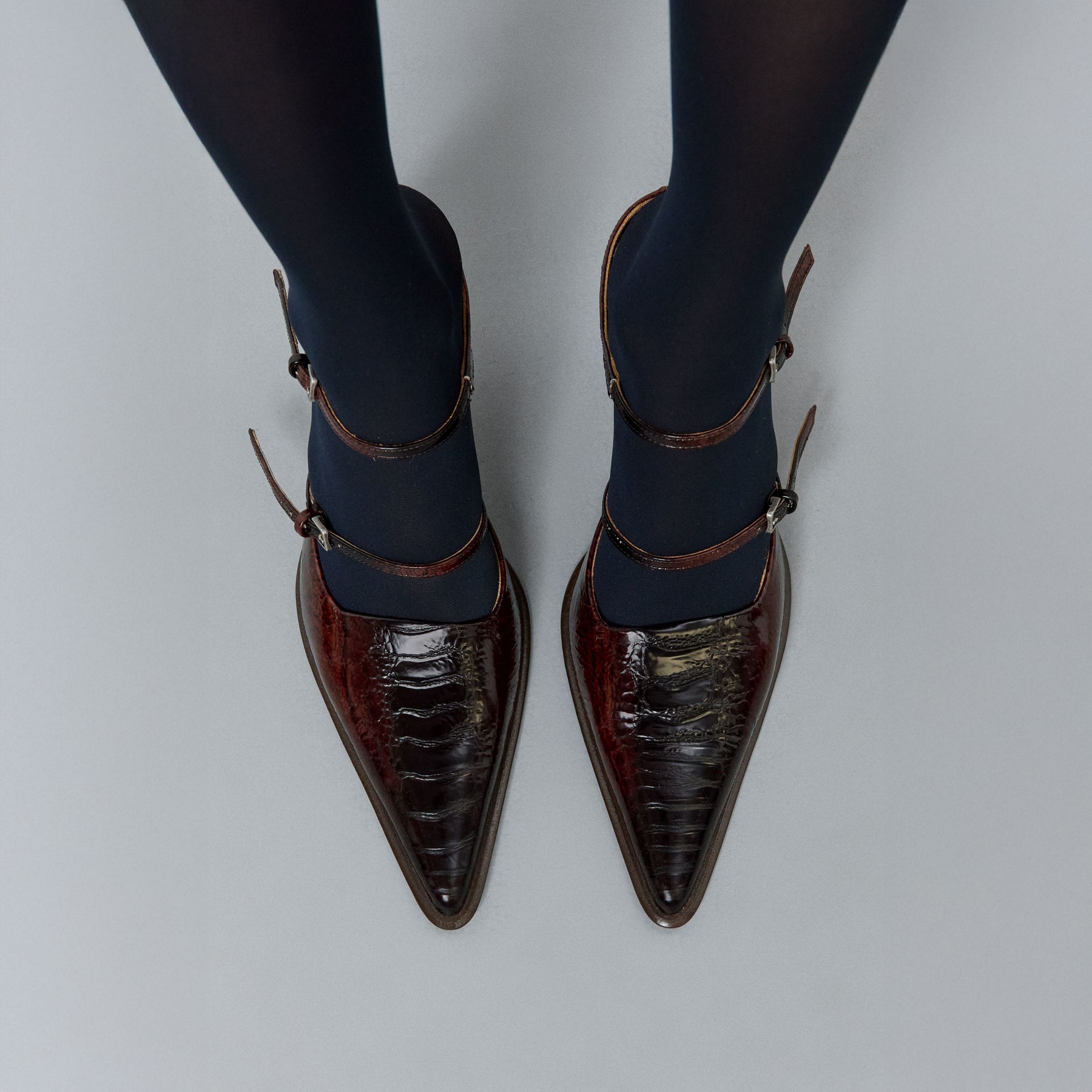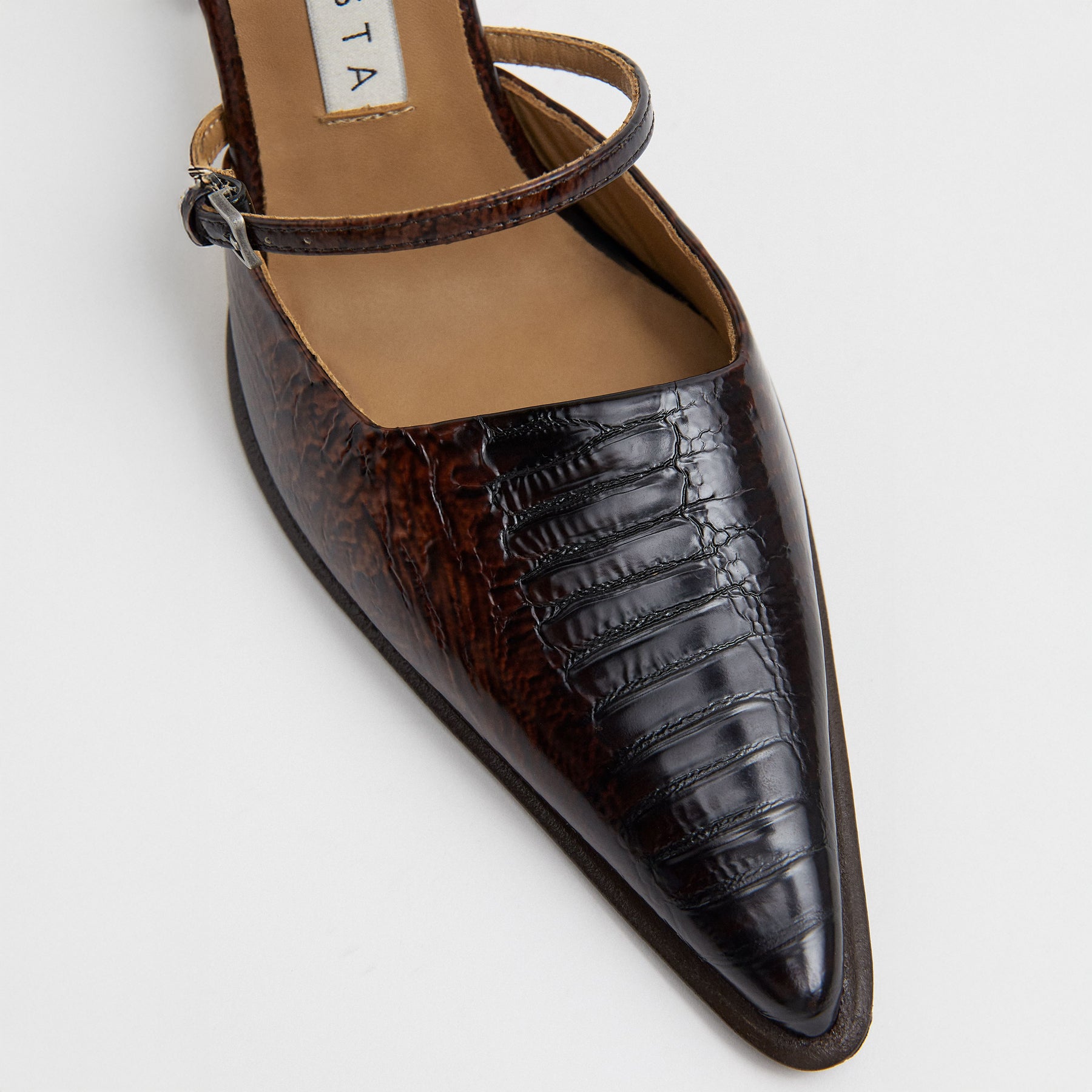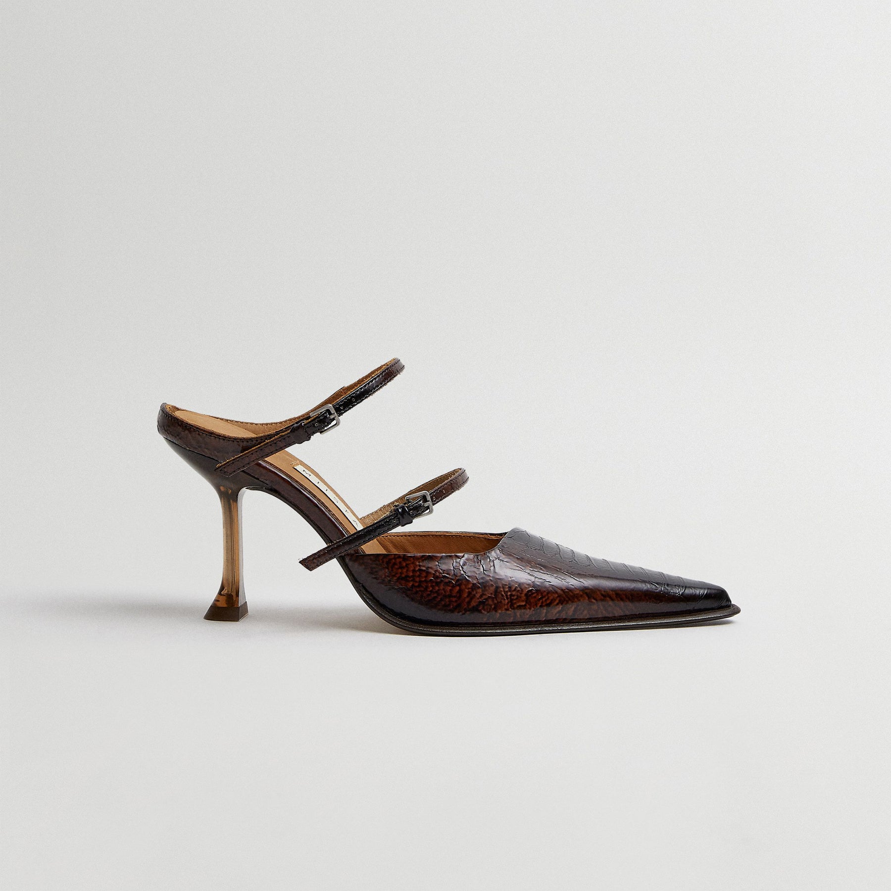 The Shari Mule is a sleek brown snake-effect leather heel with two thin buckled straps across the front of the foot; an elongated pointed toe, and a shapely 3.5 inch high heel with a flared angular base.