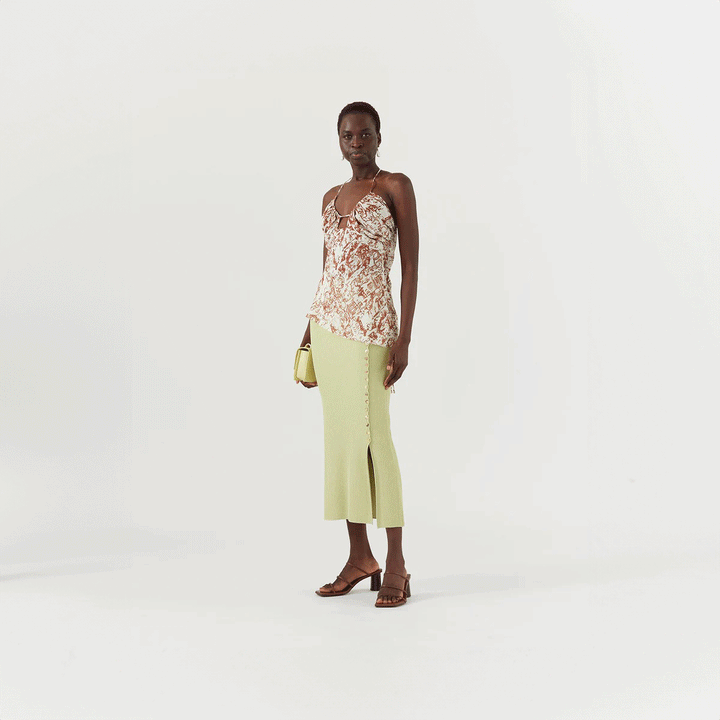 The Rejina Pyo Mei Top in Chiffon "Renaissance" Printed Brown is an intricate and light silk blend with a ruched detail open chest and keyhole. The back features a low drape with ribbon tie detailing.