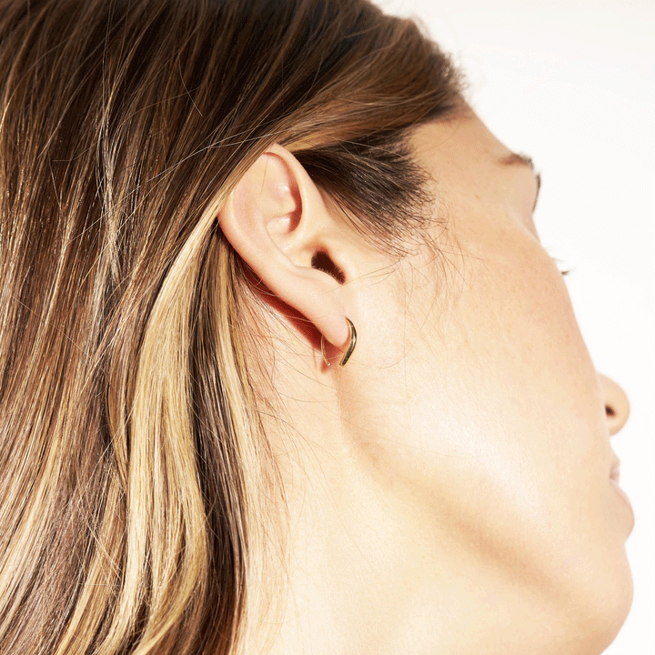 The perfect minimal curve for your earlobe, the Courbe hoop in solid recycled 14K gold. First carved in wax by hand then cast in recycled 14K gold.