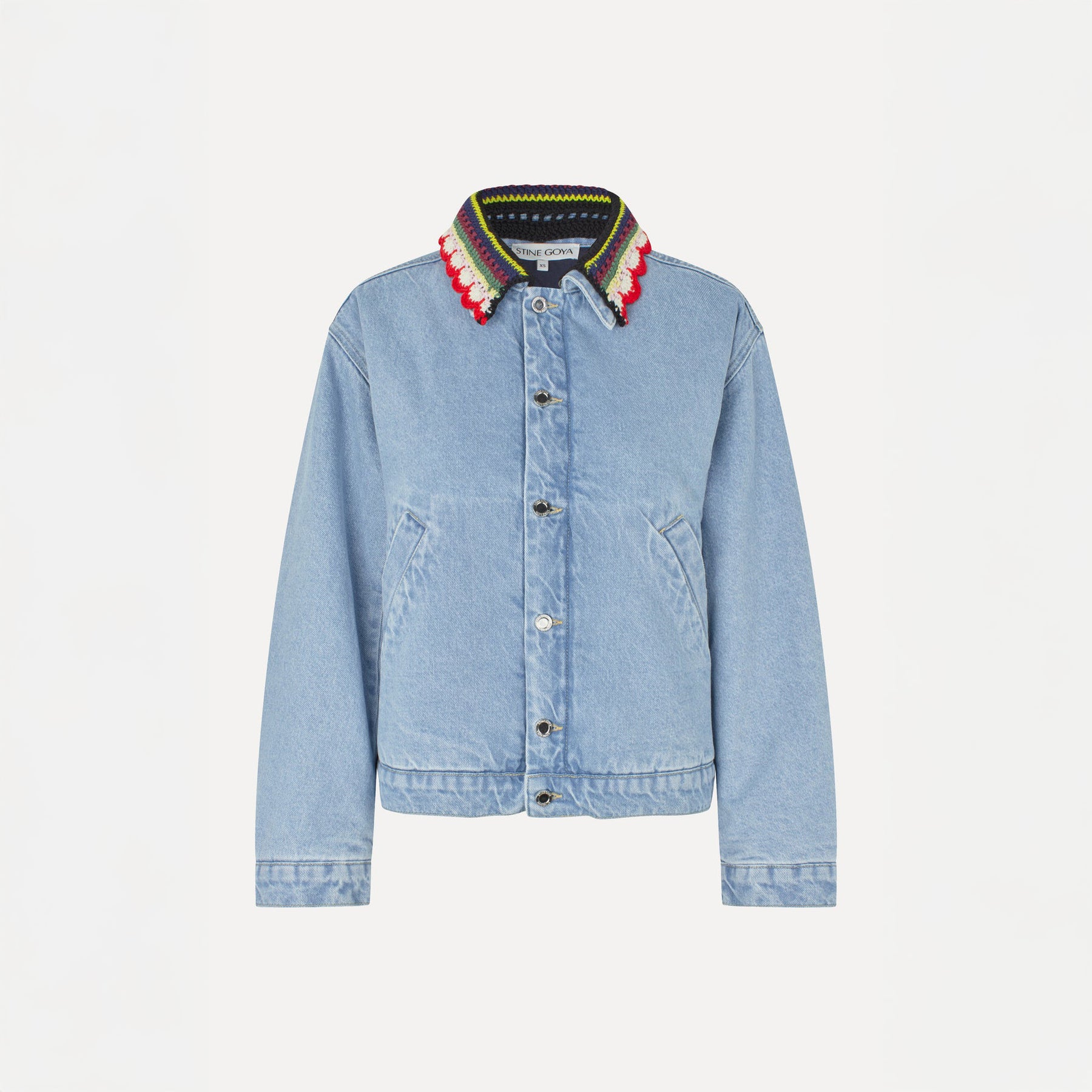 Effortlessly cool in light blue denim, this oversized bomber jacket combines comfort with style. The padded construction keeps you warm while the relaxed fit allows for easy layering. Standout details include a removable crochet collar for versatile styling options, classic button closure, and a signature logo patch on the back.