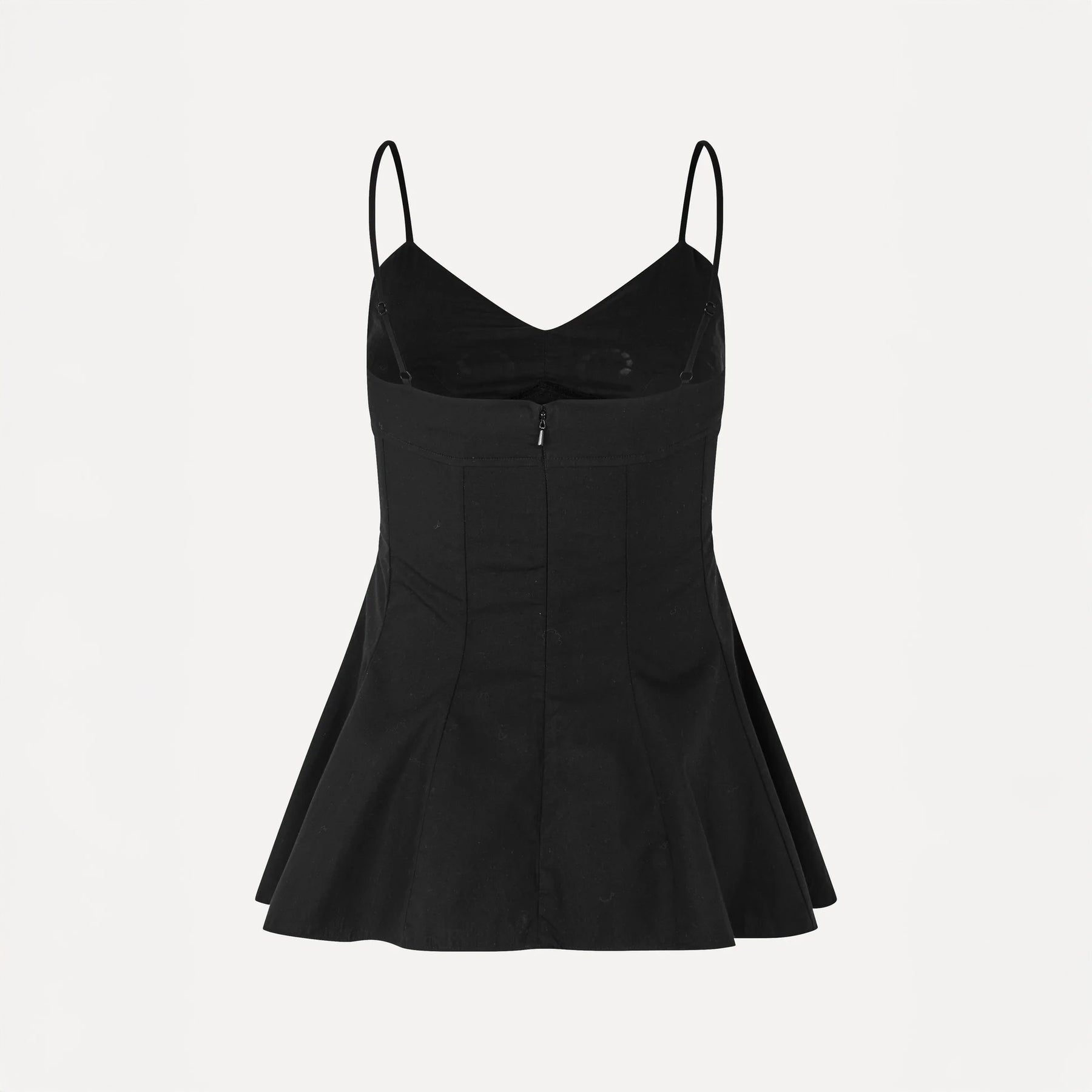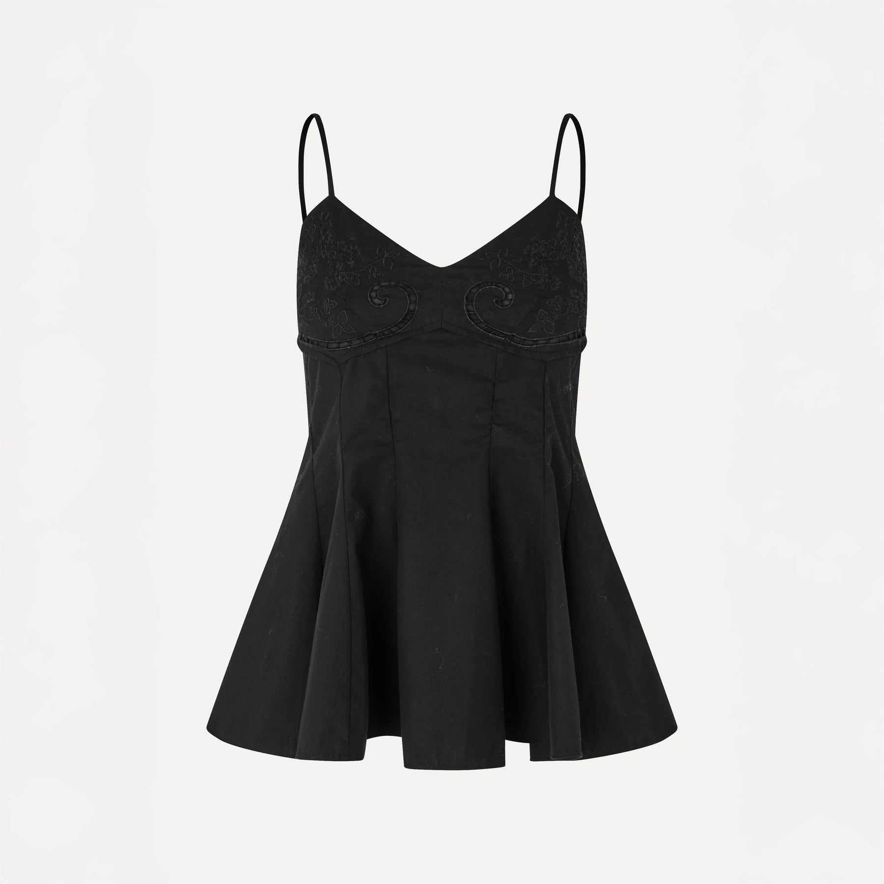 Made from organic cotton, this top showcases intricate Broderie Anglaise embroidery for refined detail. The fitted bustier silhouette is beautifully balanced with a playful peplum hem, while thin adjustable straps provide a personalized fit. A convenient back zip closure adds practicality to this piece that functions beautifully day to night.