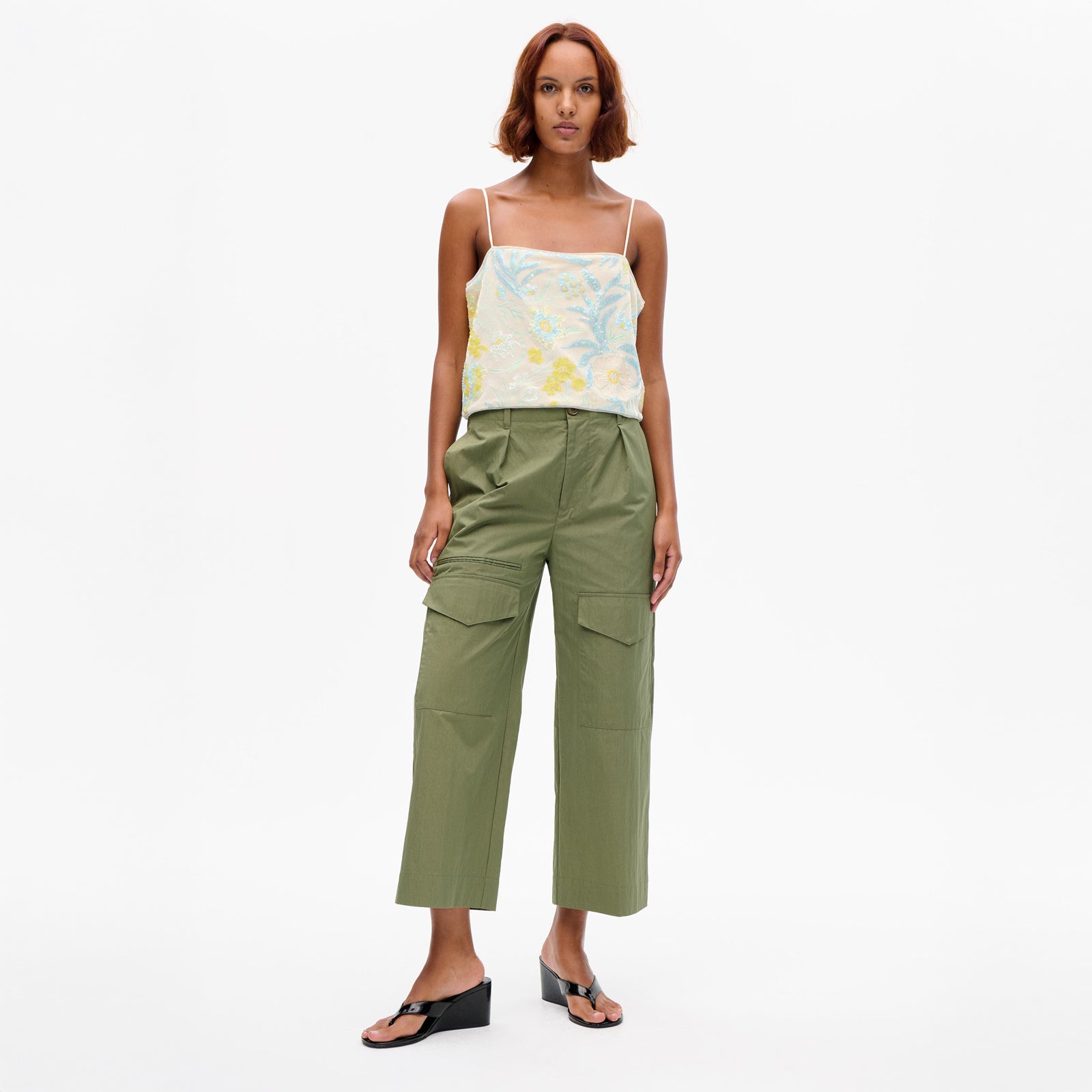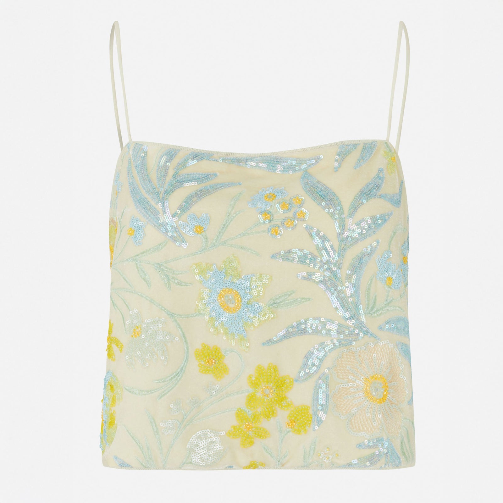 The Jovana Top is made in velvet with a decorative floral pattern of sequins, beads, and stitching. The top is designed with a fitted, cropped silhouette and thin straps.