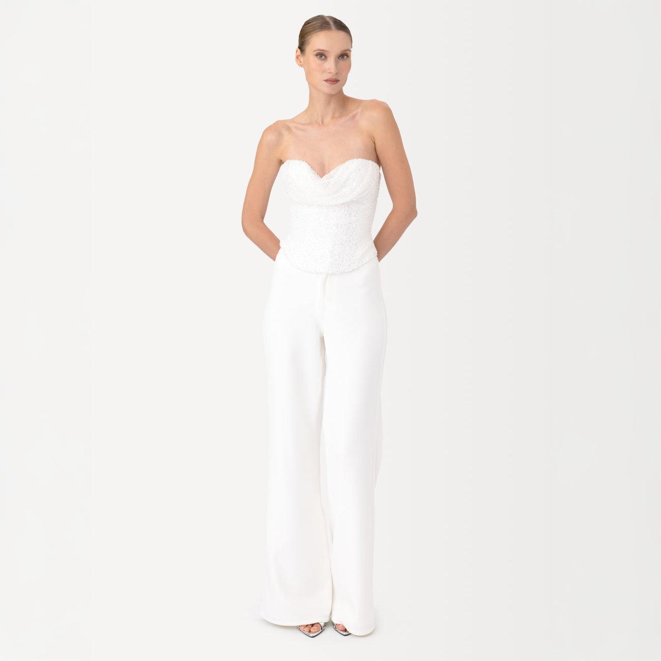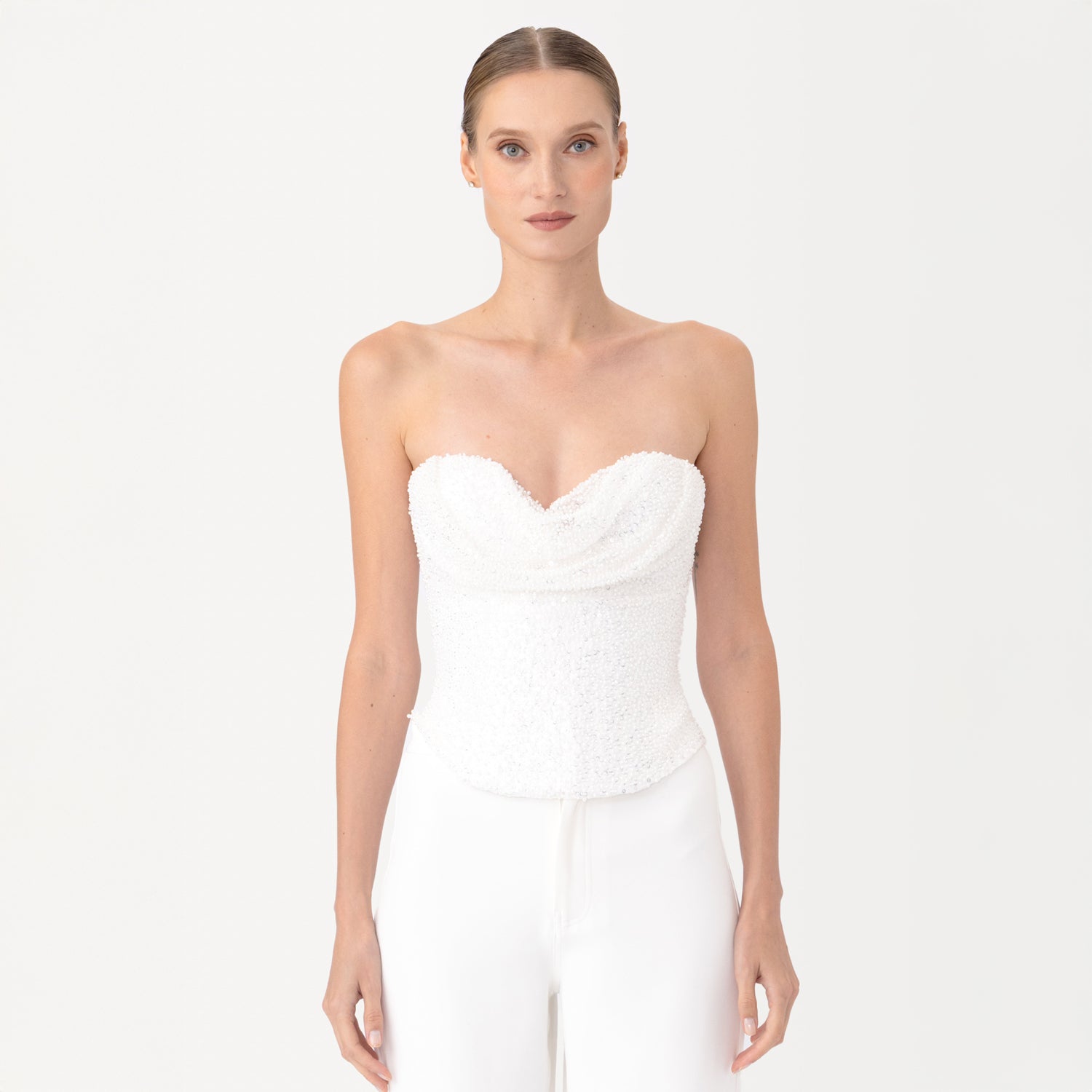 The Lin beaded corset top is crafted from sequin and pearl-beaded fabric. It features a built-in structured corset-style bodice that offers support and shape. The draped sweetheart neckline adds a soft touch, while the exposed zipper provides a modern edge. Perfect for pairing with the Lin crepe pants.